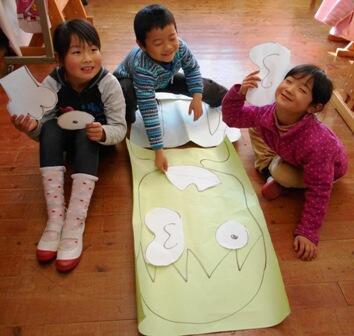 今週、英語表現の授業で福笑いをしながら顔や体の名前を覚えたそうで、