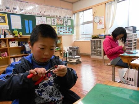 針金とペンチで、なにやら難しい表情で製作活動に集中しています。