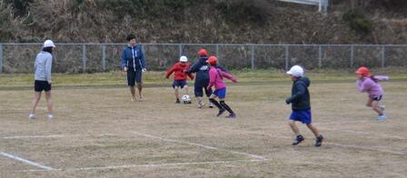 外の気温が低い中、小学生全員でサッカーをしました。みんな一生懸命1つのボールを追いかけていました。みんな楽しそうですね。