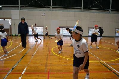 その後、各自、縄跳びを持ってケンケン飛びでリレーを行っていました。