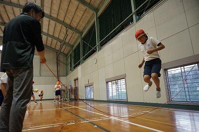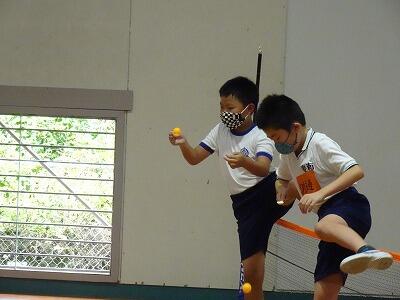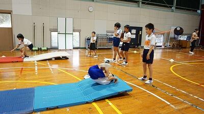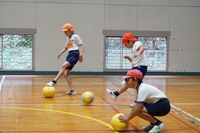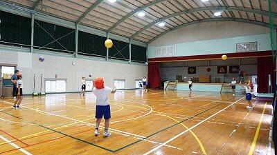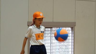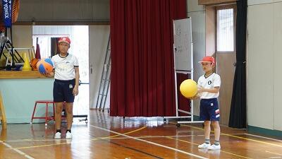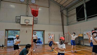 小学生の体育の様子です。バスケットボール競技のオリエンテーションを行いました。いろいろな投げ方やドリブルの仕方を身に付け、力一杯のシュートが決まるようになるといいですね。