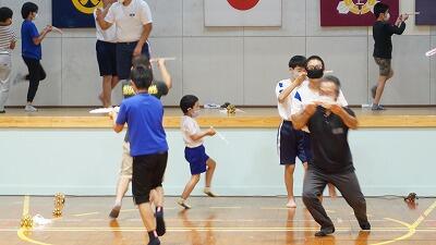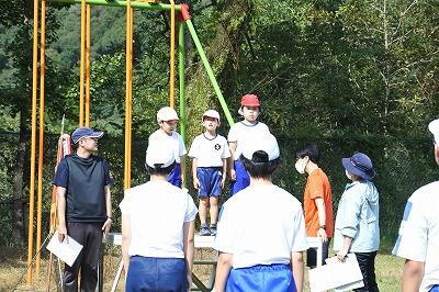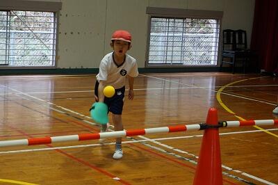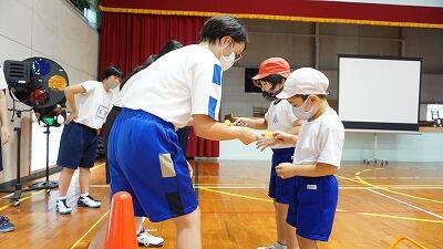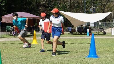 小学生の団技の様子です。日本の棒に箱を載せて運んだり、棒の両端をもってコーンを回ったり、ペアで協力し合っての競技でした。
