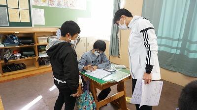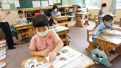 国語の授業では、漢字ドリルで新しい漢字の読み方を確認しました。大きな声で音読していました。