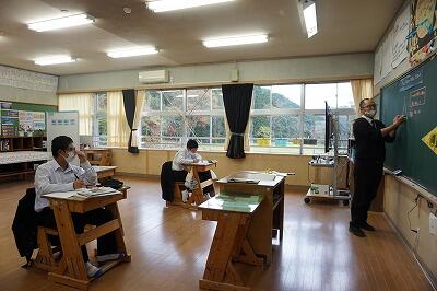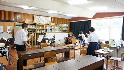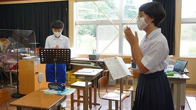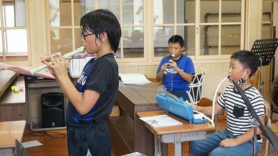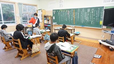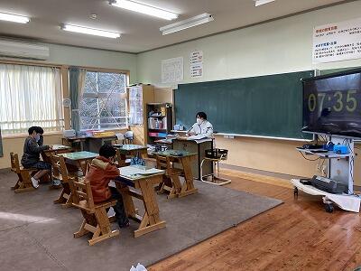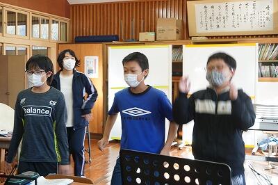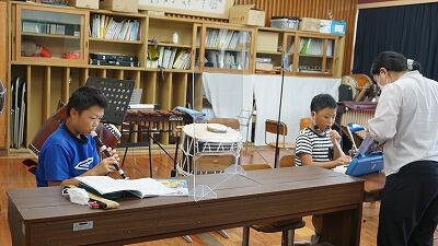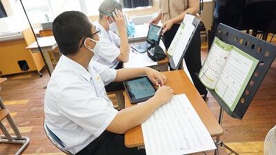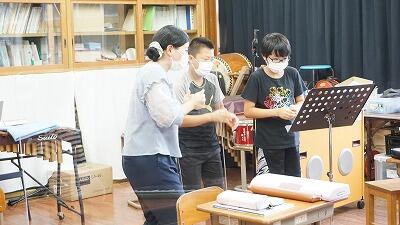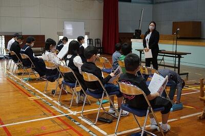 小学5・6年生の音楽の授業の様子です。今日の授業では、2つのグループに分かれ、楽譜を見ながらリズムをとる練習をしました。