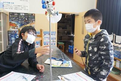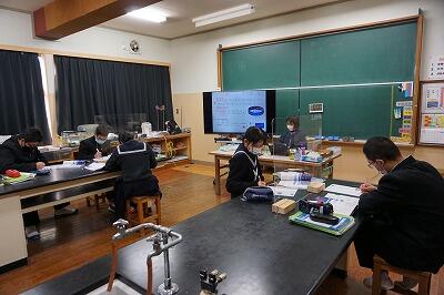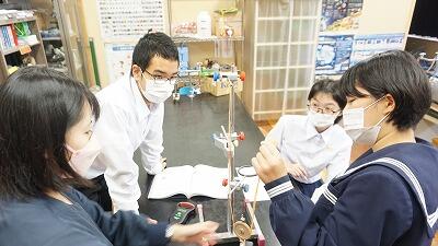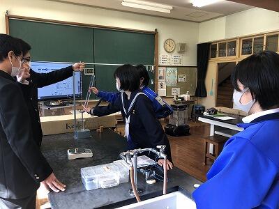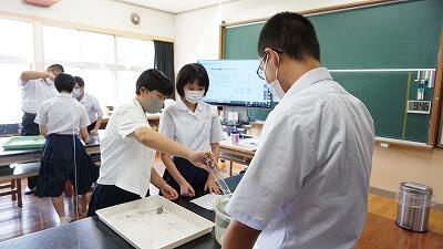 中学3年生の理科の様子です。水中の物体にはどんな力がはたらいているのか調べています。物体を沈める深さにかかわらず、浮力は同じになることが分かり、生徒達は少し驚いた様子でした。