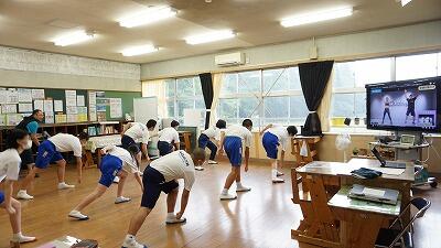 中学生体育の授業の様子です。10月3日の運動会に向けての練習が始まっています。本校の運動会では、昨年度から開会式の中の準備運動の体操は、中学生が創作しています。今日は、まずTVスクリーンで動画を見ながら細かな動きを確認しました。これからの小中学生合同の練習を通して、細かな動きを小学生にも指導していかなければなりません。まずは、指導する側の中学生がしっかり覚えられるといいですね。