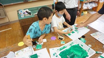 小学校1・2年生は、図工の授業で版画をしました。プラスチックの板に、ねじやキャップを使って絵や模様を描いて、絵の具を塗り紙に転写しました。