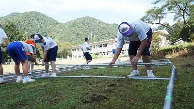 全学年合同の運動会練習の様子です。前半は運動場の整備やテント張りを行い、後半に開会式の練習をしました。