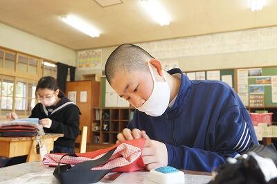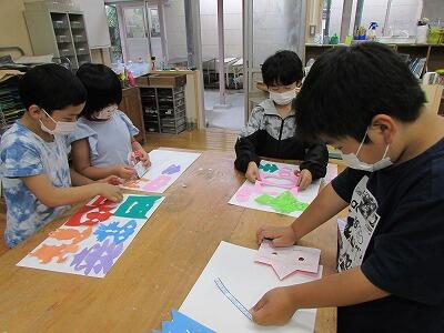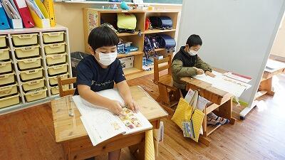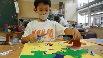 小学1・2年生の図工の授業の様子です。折り紙を折って、左右対称になる特徴を生かし、動植物の形を作ってみました。はさみを使って、細かいところまで器用に切る作業ができていました。