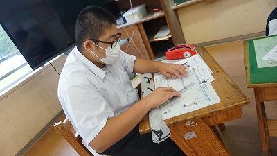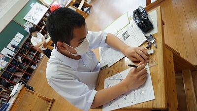 中学1年生の数学の様子です。正の数、負の数の乗除を学習しました。少数の問題に悪戦苦闘していました。