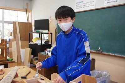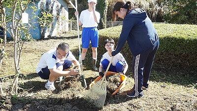 技術の授業では、栽培の分野で、植えた苗に支柱を立てる作業をしました。慣れない土いじりですが、楽しそうでした。