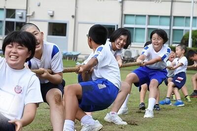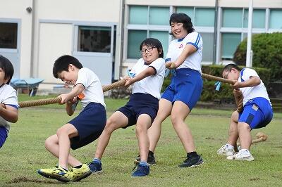 PTA奉仕作業でとてもきれいになったグラウンドで、応援練習や全校リレー、綱引きを行いました。