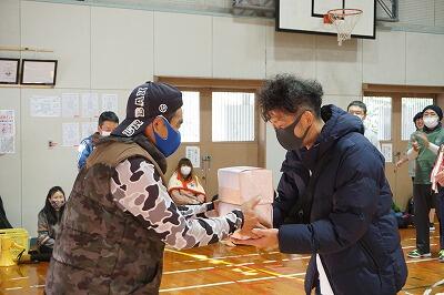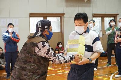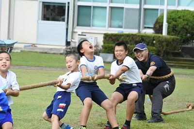 小中学生合同での「綱引き」の様子です。できるだけ腰を低くしながら、必死に縄を引っ張り合いました。今年度は赤団の圧勝でした。