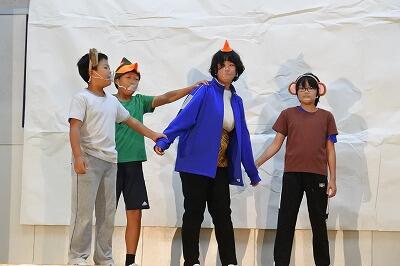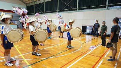 小学生が西都市の伝統芸能でもある「子ども臼太鼓」を披露している様子です。小学5,6年生はひもろぎと太鼓、1,2年生は太鼓を付けて、軽快なリズムに乗って踊りました。
