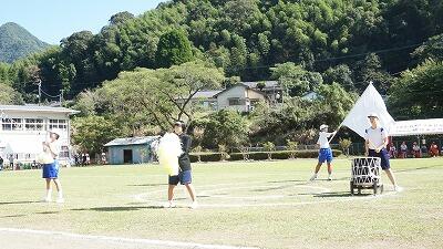 小中学生合同での「玉入れ」競技の様子です。小学生は円の中から、中学生は円の外から網の中に玉を入れます。今日は白団が2勝しました。