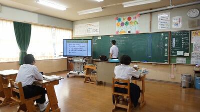小学6年生は算数です。分数のかけ算を使って、面積や体積を求める授業をしました。分数を使った問題を式に表して答えを求める応用問題までしっかり解けていました。