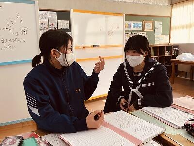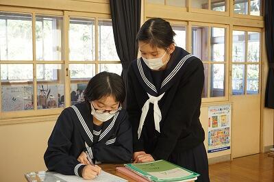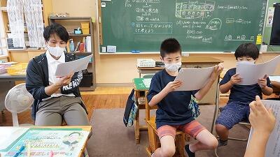 小学2・5年生は国語です。2年生は、「大事なことを落とさずに聞くために大切なこと」を考えました。大事な言葉のみをメモしながら聞くことの大切さに気付き、迷子の放送を聞き取ることに挑戦しました。