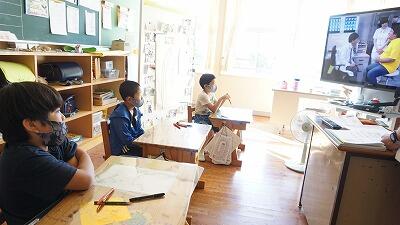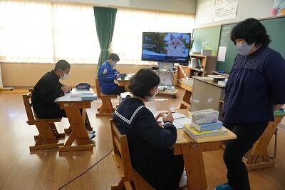以前はランチルームで全校児童生徒と一緒に給食を食べていました。コロナ禍の影響で各学級で食べています。