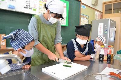 小学1・2年生が生活科の授業で、枝豆とトマトの苗を植えました。たくさん実がなるように脇芽を摘みました。大きく育つのが楽しみですね。