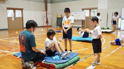 小学生の運動機能調査の様子です。宮崎大学医学部看護学科の先生方が来られて、運動機能の検査を行いました。測定器のセンサーにより、歩くスピードやひざの角度、歩幅を測定しました。また、魚のかぶりものをつけておさかなダンスをおどり、バランスをとったり、体を支えたりと、いろいろな動きを行いました。子どもたちはみんな上手に楽しくおどれていました。