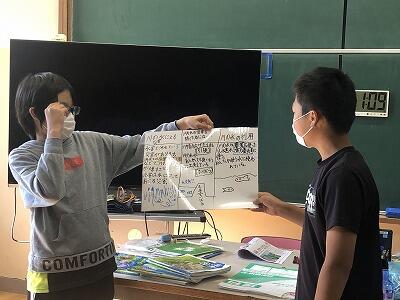 中学3年生の英語の様子です。「ディベートをしよう」という内容で、本を読むのに家が良いか、図書館が良いかということについて、英語でディベートができるように準備しました。