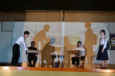 中学生が銀鏡の伝統芸能の1つ、「銀鏡臼太鼓」を披露している様子です。地域の方々にご協力いただき、歌に合わせて太鼓や鐘を鳴らしながら踊りました。