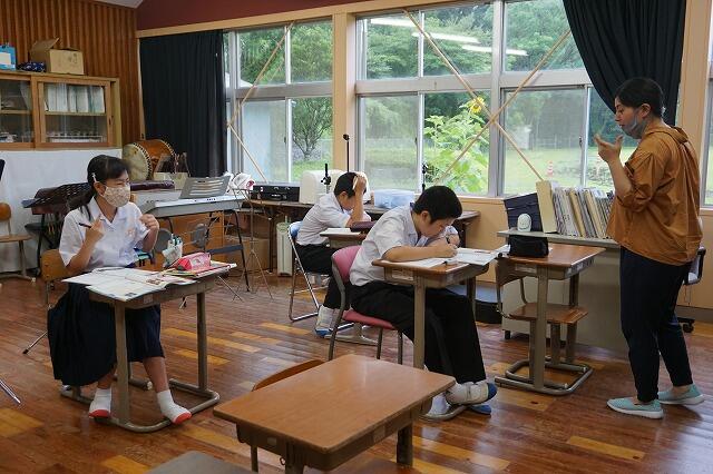 中学1年生の音楽の授業の様子です。自分たちで太鼓の曲を作っています。曲の初め・中・終わりの部分をそれぞれが担当して作り、お互いに教え合って1つの曲を完成させていきます。