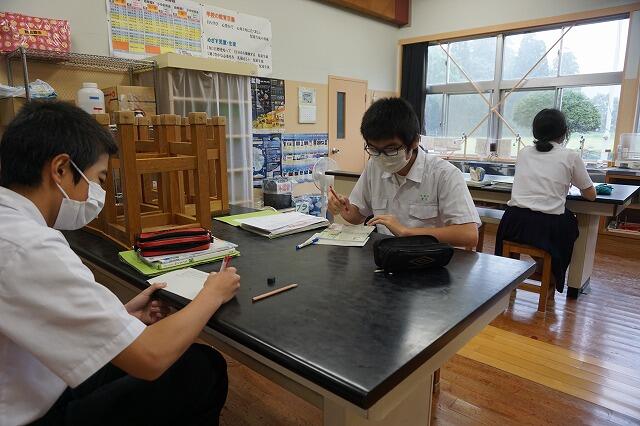 中学3年生の英語の様子です。リスニングの練習問題に取り組みました。家ではなかなか取り組むことができないため、気を引き締めて英文に聞き入っている様子でした。