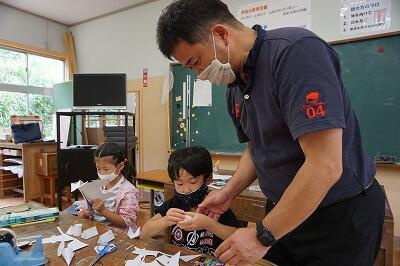 小学1・3年生の図工の様子です。画用紙で凧(たこ)を作りました。簡単なしくみのたこですが、よく飛んで子どもたちも喜んでいました。