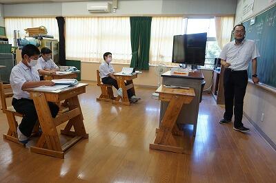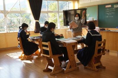 中学2年生の英語の授業です。英単語の発音や意味を全体で確認していました。一つ一つの英単語をしっかりと声に出し、覚えようと取り組んでいました。