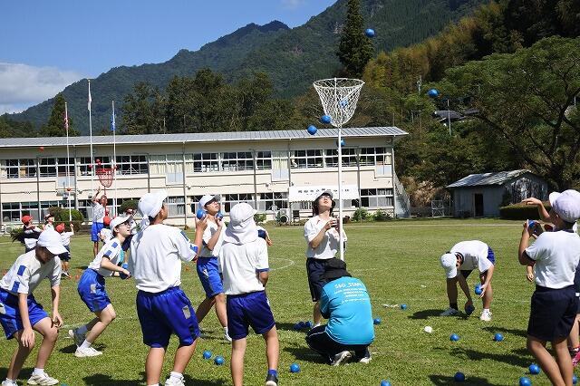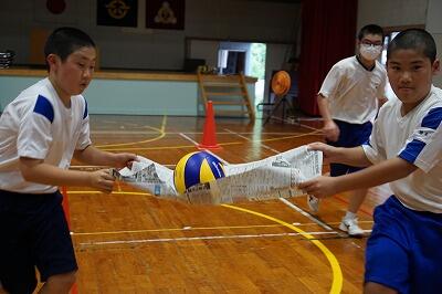 小学生の体育の様子です。ミニバレーのサーブ練習をしました。狙ったところにボールを飛ばすことができるよう、くり返し練習をしていました。授業の終わり頃には狙った場所の近くにボールを飛ばすことができるようになっている子どももいました。これからどのように上達していくのか、とても楽しみですね。
