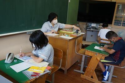 小学1年生の授業です。姿勢に気を付けながら、国語の書取を行っていました。3人仲良く、今日も勉強や掃除に頑張っています!