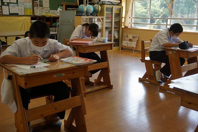 中学2年生:コロナ感染拡大防止のため、4月から延期になっていた県数テストが実施されました。みんな時間いっぱい頑張って解いています。