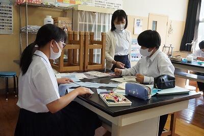 中学1年生は技術の授業で、用具整理のための柵を作って、サンドペーパーで磨きました。学校にこんなものがあったらいいなというコンセプトでいろいろなものを製作しています。