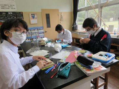 中学1年生の美術です。作品の色塗りに集中していました。明るい色の作品やかわいらしい作品ができています。