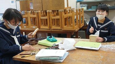 3年生は、オルゴールの木箱を彫刻刀で浮彫をしていました。