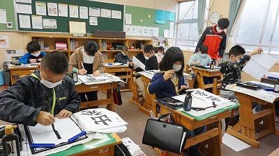 小学生は、書写の授業で書き初めをしました。これまで学習した点画の止め・はね・払いを意識しながら書くことができました。
