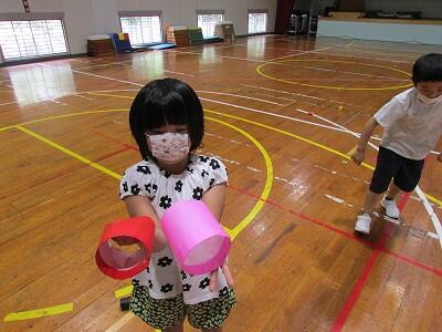 割り箸と輪ゴムを使って、鉄砲を作りました。厚紙で作った的に狙いを定めて上手に当てていました。みんなで的当てを競争して、得点を出しました。優勝は3年生の男の子でした。優勝メダルをもらって、喜んでいました。