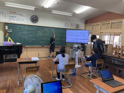 小学2.5年生の算数の様子です。2年生はかけ算の意味を考えながら文章に合わせて式をたてる練習をしました。5年生は、「図を使って考えよう」の2時間目で、数直線を活用して問題に取り組みました。
