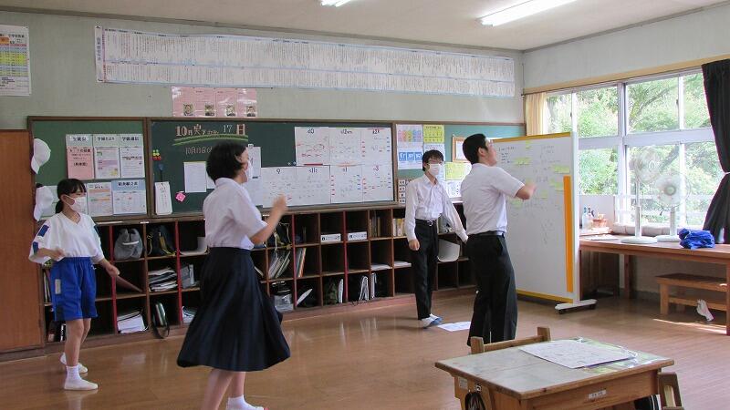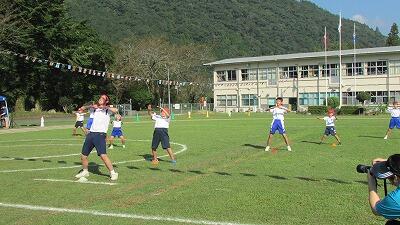 今日は体育の授業の様子を紹介します。本校の体育は、小学生も中学生も全学年一斉に実施しています。小規模校の特性を生かして、異学年交流を図りながら指導を行っています。