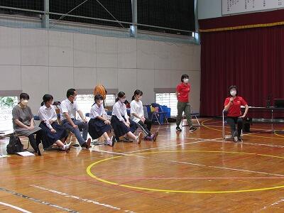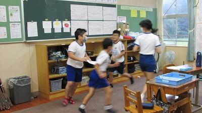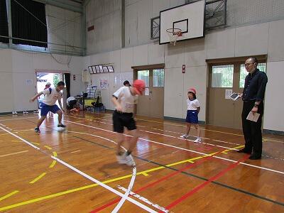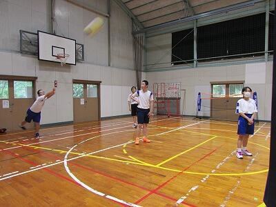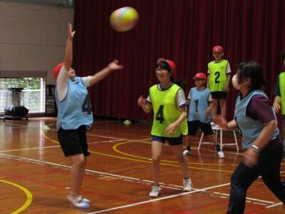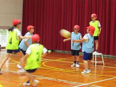 小学生の体育の様子です。2チームに分かれて、ポートボールをしました。どちらのチームも、声を掛け合いながらボールをつなぎ、得点を狙いました。6分間、一生懸命走り回ったあとはみんな汗だくになっていました。