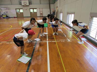 立ち幅跳びは、跳躍力を測定します。体全体を上手に使って、飛ぶ力やタイミングを考えながら少しでも距離を伸ばそうと頑張りました。