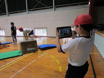 今日は開脚跳びの練習をしました。跳んでいる様子をタブレットで撮影し、フォーム等を確認しました。