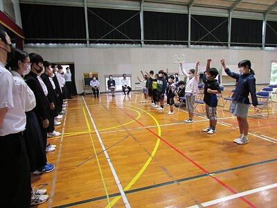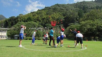 今日は体育の授業の様子を紹介します。本校の体育は、小学生も中学生も全学年一斉に実施しています。小規模校の特性を生かして、異学年交流を図りながら指導を行っています。