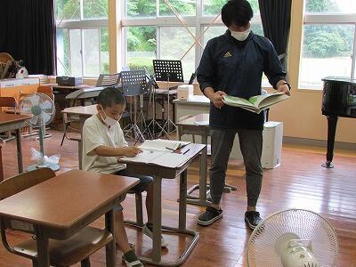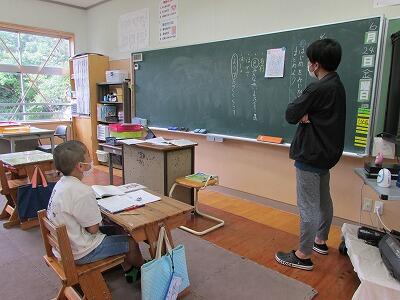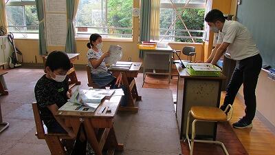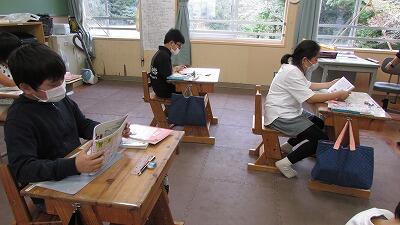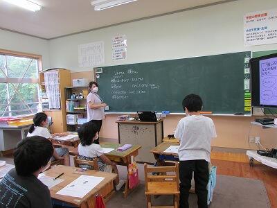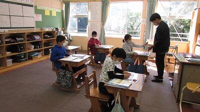 小学1・3年生の国語の様子です。1年生は、新出漢字をドリルノートで復習しました。「くじらぐも」の音読をし、5つの場面にそれぞれどんなことが書かれているかまとめました。3年生は新出漢字を学習しました。筆順と形に気をつけて丁寧に書きました。「ちいちゃんのかげおくり」のあらすじを話し合ってまとめました。