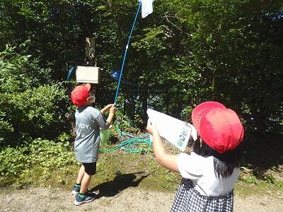 割り箸と輪ゴムを使って、鉄砲を作りました。厚紙で作った的に狙いを定めて上手に当てていました。みんなで的当てを競争して、得点を出しました。優勝は3年生の男の子でした。優勝メダルをもらって、喜んでいました。