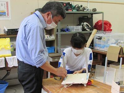 小学1年生から3年生は図工の時間に飛行機を作って飛ばしました。円形にした画用紙とストローで作った飛行機です。どのくらい飛ぶのか、皆で競争をしました。