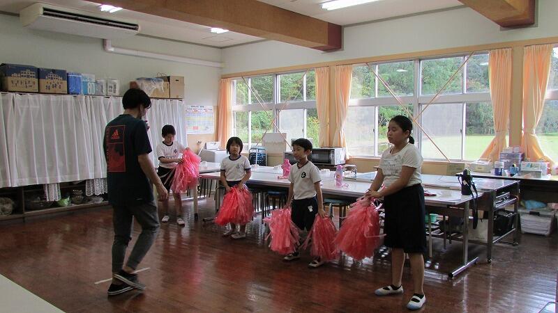 小学生は赤団・白団に分かれて、応援の練習をしていました。どちらの団も、動きを確認しながら大きな声で練習していました。