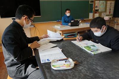 小学1・3年生の国語の授業です。一文字一文字を丁寧に書いています。書き終わった後は、先生に確認してもらいました。褒められて、にこにこのみんなです。