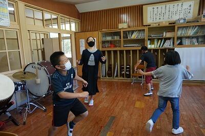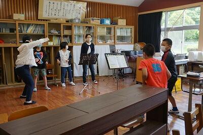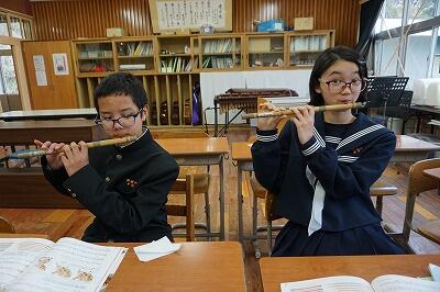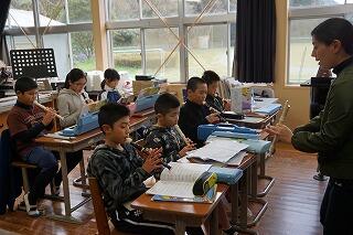 小学生は音楽の授業で合奏をしていました。後半になると音が揃って練習の成果が出始めました。